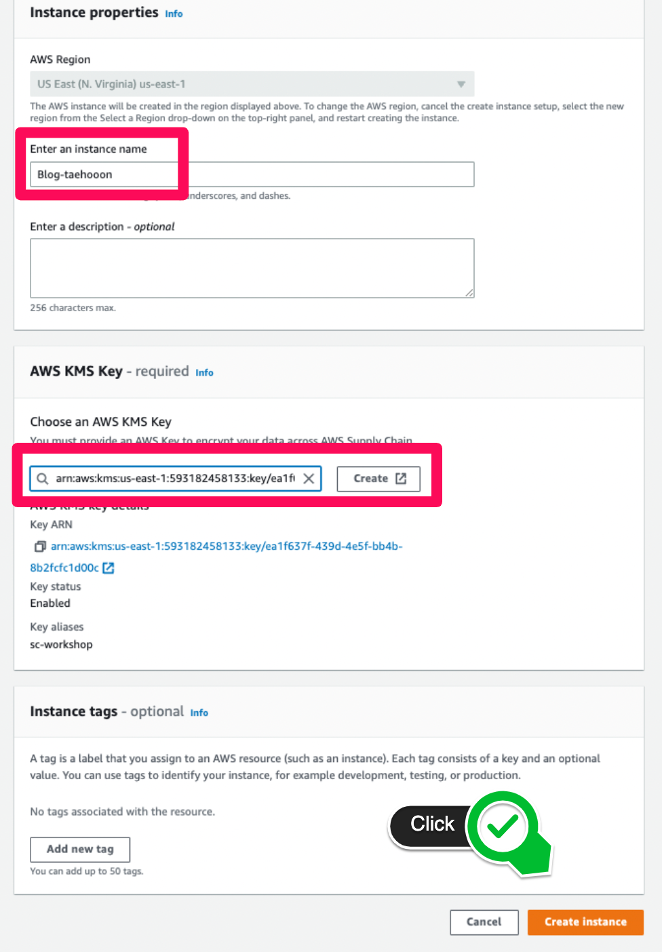 - ‘Instance name’을 입력하고 데이터 암호화를 위한 AWS KMS 키를 선택합니다.