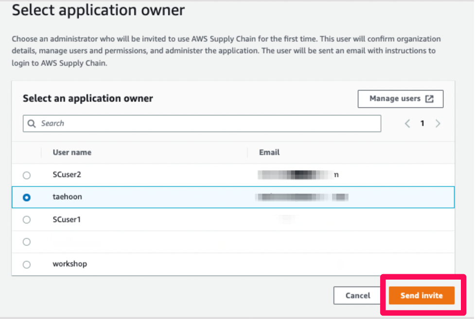 - ‘Select an application owner’를 클릭하여 애플리케이션에 접속할 사용자를 선택하고 ‘Send Invite’를 클릭합니다. 사용자는 언제든지 추가할 수 있습니다.