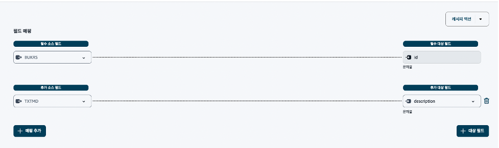 데이터 연결을 생성한 후에, 각 엔티티 별 매핑 레시피를 확인하실 수 있습니다. 아래의 그림과 같이 가장 먼저 ‘회사’ 카테고리에 대한 매핑 레시피를 나타냅니다. 회사 코드(BUKRS)는 필수 소스 필드로서 SAP 계층에서 가장 위에 있는 계층입니다. 여러 법인이 있는 기업의 경우, 회사 코드를 기준으로 회사명(TXTMD), 언어(LANGU), 플랜트(WERKS), Cost Center(PRCTR) 등을 매핑하고 관리할 수 있습니다. 여기서는 추가 소스 필드로 TXTMD를 수집할 수 있습니다. 해당 필드에 대한 데이터를 수집한다면 BUKRS는 id, TXTMD는 description으로 각각 매핑이 됩니다. 데이터에 대한 추가적인 내용은 ‘단계 3: SAP 데이터 이해 및 준비’에서 확인합니다.