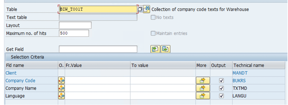 각 엔티티 별로 제공되는 매핑 레시피에서 ‘필수 소스 필드’는 변경이 불가능 하지만 ‘추가 소스 필드’의 경우, 지원되는 형식의 데이터가 있다면 추가할 수 있습니다. 예를 들어 아래의 그림은 SAP T-CODE SE16N에서 ‘BIW_T001T’ 테이블을 조회한 내용입니다. 사용자는 LANGU필드를 제외한 BUKRS와 TXTMD를 사용해도 되지만 LANGU필드를 매핑 레시피에 추가할 수도 있습니다.