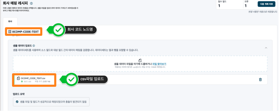 다음으로 저장한 csv 파일을 아래와 같이 회사 노드(0COMP-CODE-TEXT)에 드래그 & 드롭 방식으로 업로드합니다.