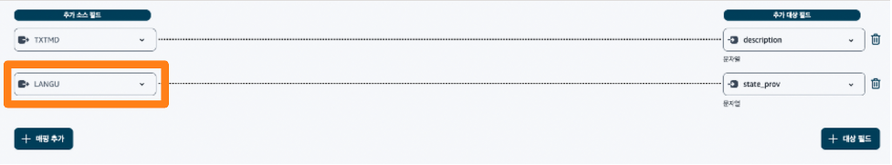 추가 대상 필드를 드롭 다운하면 ‘LANGU’와 매칭할 필드를 선택할 수 있는 데, 여기서 ‘LANGU’와 매핑이 되는 필드가 존재하지 않으므로 사용할 수 없습니다.