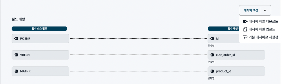각 매핑 레시피는 고유의 레시피 파일이 존재하며 우측의 ‘레시피 액션’을 클릭하여 레시피 파일을 다운로드할 수 있습니다. 레시피 파일을 활용하면 2가지의 이점이 있습니다. 첫째, 수집이 실패할 때, 디버깅하는 용도로 사용할 수 있습니다. 둘째, 기존 레시피에 없는 필드를 추가하고 싶을 경우, 로직을 추가하여 파일을 업로드하실 수 있습니다.