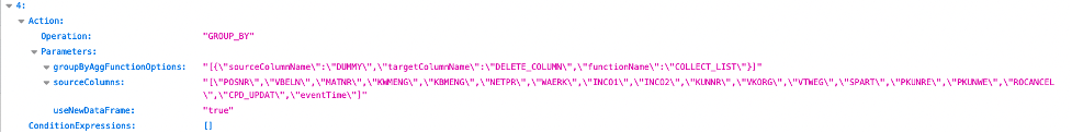 아래의 예시는 ‘아웃바운드 주문 라인’ 레시피로 그룹화(Group By)에 필요한 컬럼 리스트가 나열된 것을 확인할 수 있습니다. 해당 레시피는 ‘아웃바운드 주문 라인’ 데이터를 수집하기 위한 필수 조건으로 스텝을 추가하는 것 외에 지우거나 변경하면 안됩니다.