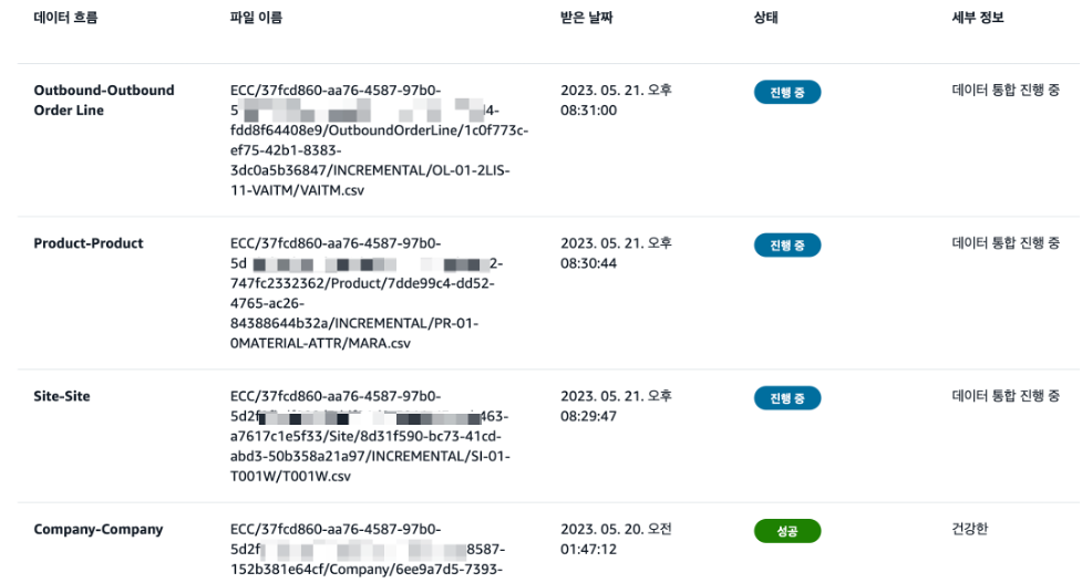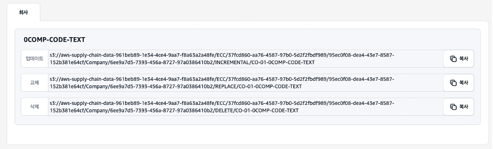 데이터가 준비되면 AWS Supply Chain 데이터 레이크에서 지정한 S3버킷 경로에 직접 파일을 업데이트, 삭제하도록 미들웨어 솔루션을 구축하거나 AWS CLI를 통해 직접 수집할 수 있습니다. 데이터 수집 방법은 업데이트(Update), 교체(Replace), 삭제(Delete)가 있으며, 각각 별도의 S3경로를 복사하여 사용할 수 있도록 제공합니다. 이 글에서는 csv파일을 AWS CLI를 통해 수집합니다.