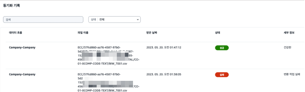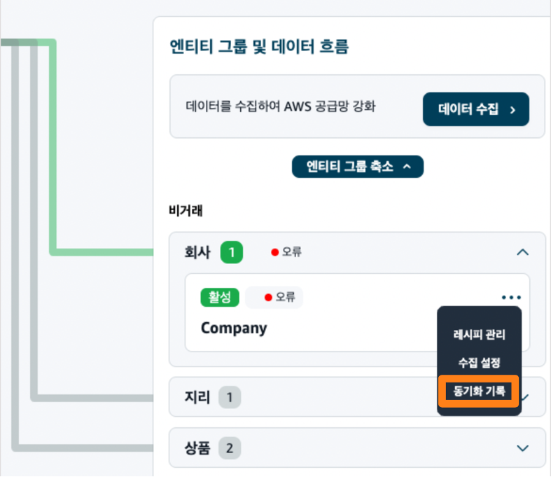 업로드 후에는 아래와 같이 데이터 레이크의 ‘회사’ 엔티티가 활성 된 것을 확인할 수 있으며, 수집 현황을 확인하려면 우측 버튼에서 ‘동기화 기록’을 클릭합니다.