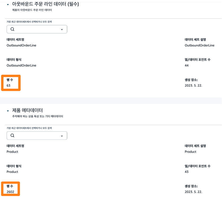 - 제품 메타데이터에 ‘Product’ 데이터 세트 선택합니다. 데이터가 잘 수집이 되었다면 수요 예측에 사용될 데이터 유무가 아래와 같이 ‘행 수’에 표현됩니다.