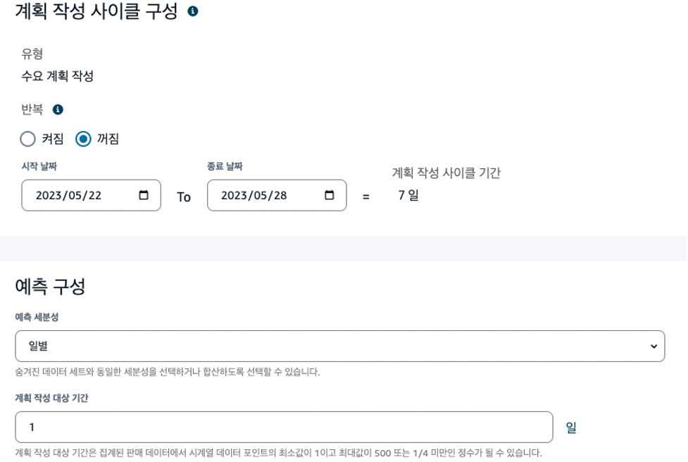 - 계획 작성 사이클 구성 및 예측 구성을 아래 예시처럼 자유롭게 입력하고 ‘리뷰’를 클릭합니다.