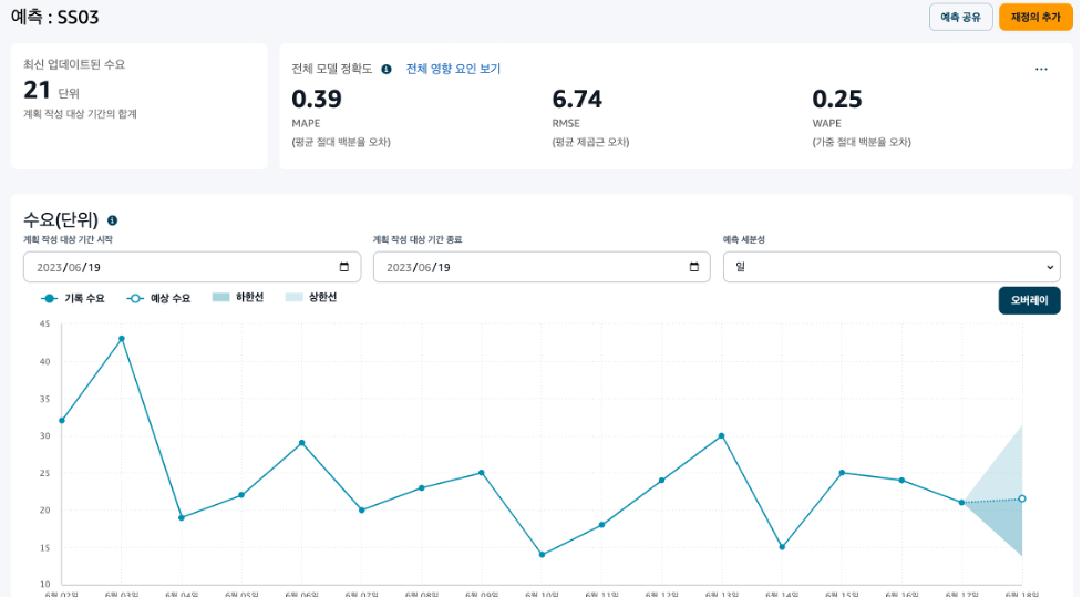- 예측이 준비가 되면 가입한 이메일로 발송이 됩니다. 예측 생성에는 데이터의 양, 주기에 따라 수분에서 수 십분 소요됩니다. 아래 예시는 제품(SS03)에 대한 일별 수요 예측을 나타내고 있습니다.