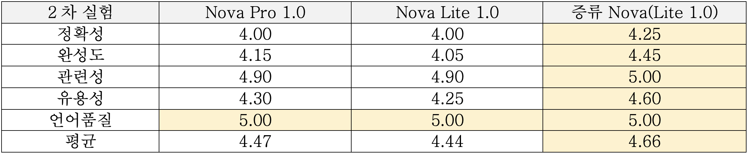 평가는 2차례 실행하였으며 결과를 요약해보면, 전체 평균 점수는 증류 Nova와 Nova Pro 모델이 비슷한 수준의 성능을 보였고, Nova Lite는 두 모델 대비 낮은 성능을 보였습니다. 증류 Nova 모델은 동일 아키텍처 모델인 Nova Lite 대비해서는 성능이 많이 개선되었습니다.