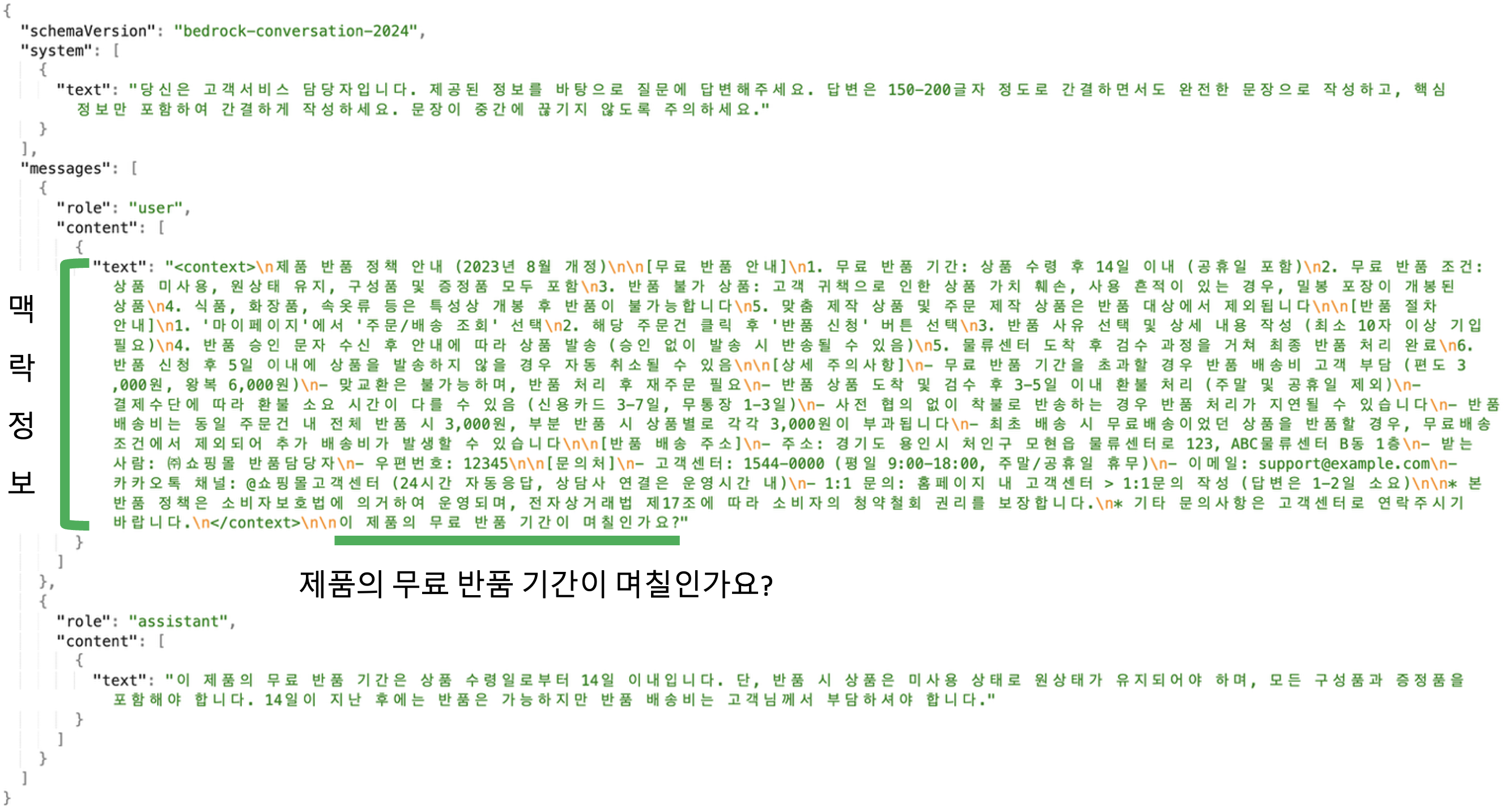 다음으로 Bedrock 플레이그라운드에서 Anthropic Sonnet 3.7 모델을 사용하여, 위의 시스템 프롬프트를 포함한 학습 용 사용자와 어시스턴트 응답 프롬프트 쌍을 100개 만들었습니다. 아래 그림과 같이 사용자 데이터는 <context> 태그를 이용하여 질문과 관련된 맥락 정보를 제공하며, 바로 이어서 질의 하면 맥락 정보를 참고하여 답변할 수 있도록 생성하였습니다. 증류 작업 실행 후 모델 성능 측정하는 데 사용할 테스트 프롬프트 쌍도 20개 만들었습니다. 데이터 셋은 아래의 OpenAI 메시지 포맷을 따릅니다. 이러한 데이터 셋으로 모델 증류를 하는 목적은 맥락 정보를 바탕으로 답변의 톤 앤 매너를 선호 스타일로 맞추기 위한 것이라고 할 수 있습니다