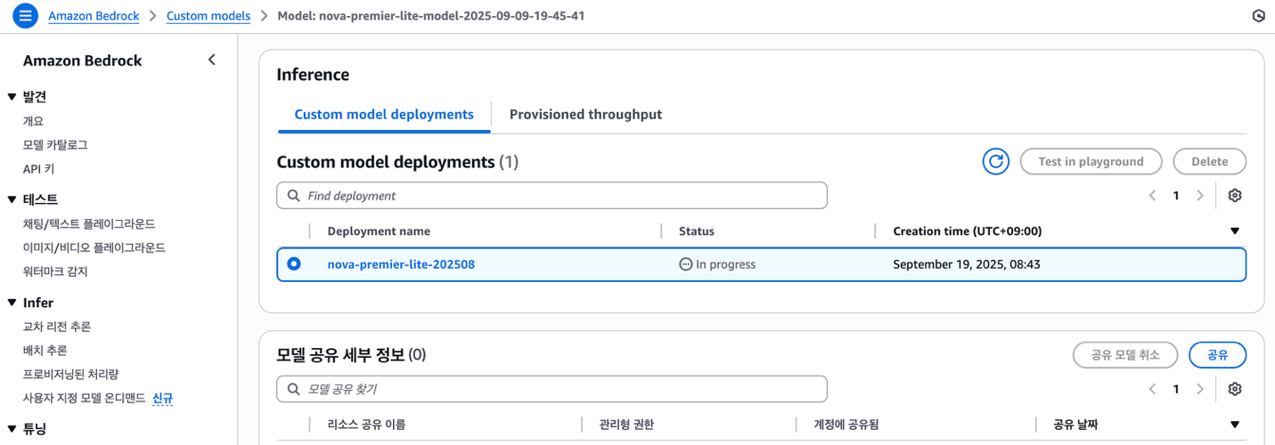 지식 증류 작업 실행 후 진행 상황은 Amazon Bedrock 콘솔 (Amazon Bedrock > Custom models > Job)에서 확인할 수 있으며, AWS CLI 명령으로도 조회할 수 있습니다.