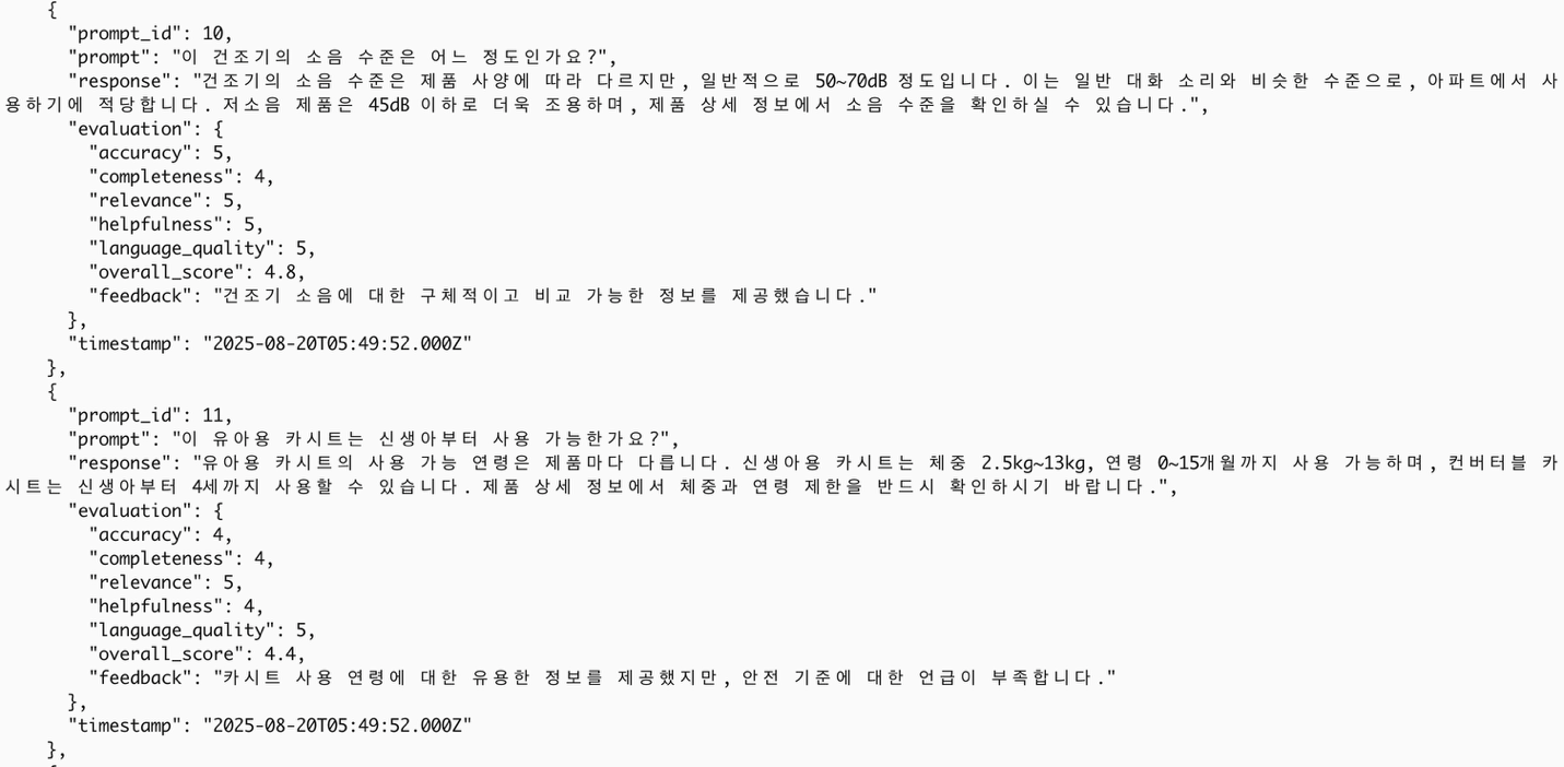 평가 기준 용 프롬프트 데이터셋을 만든 후, 채점을 맡을 평가자(Evaluator) 모델로 Anthropic Sonnet 3.7을 선택하였습니다. 평가자로 신뢰할 수 있는 모델로 생각되는 다른 모델을 사용해도 됩니다. 다음으로 이커머스 Q&A 테스트용으로 생성한 20개의 프롬프트 데이터셋을 대상으로 Nova의 각 모델별로 응답하도록 하였습니다. 각 응답 내용에 대해 평가자 모델로 5개의 품질 영역에 대해 점수를 부여하고 피드백까지 생성하도록 하였습니다.
