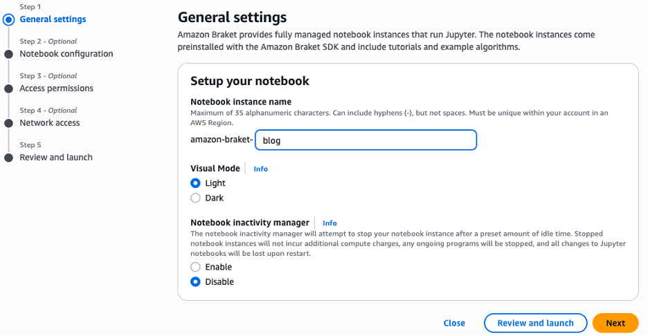 <그림 2. Amazon Braket 노트북 인스턴스 생성을 위한 초기 세팅 화면>