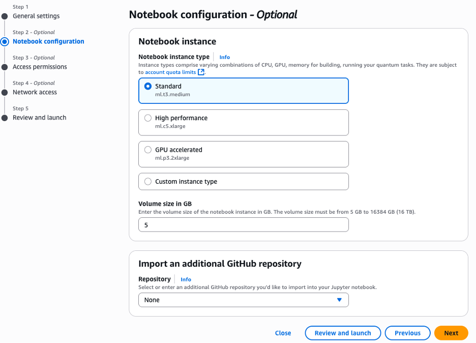 - Standard (ml.t3.medium) – 기본 설정으로, 비용 효율적인 옵션입니다. 대부분의 기본적인 양자 컴퓨팅 작업에 적합합니다.