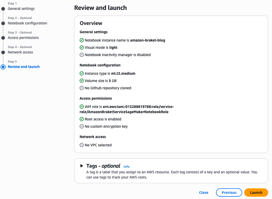 <그림 4. Amazon Braket 노트북 인스턴스 생성을 위한 최종 화면>
