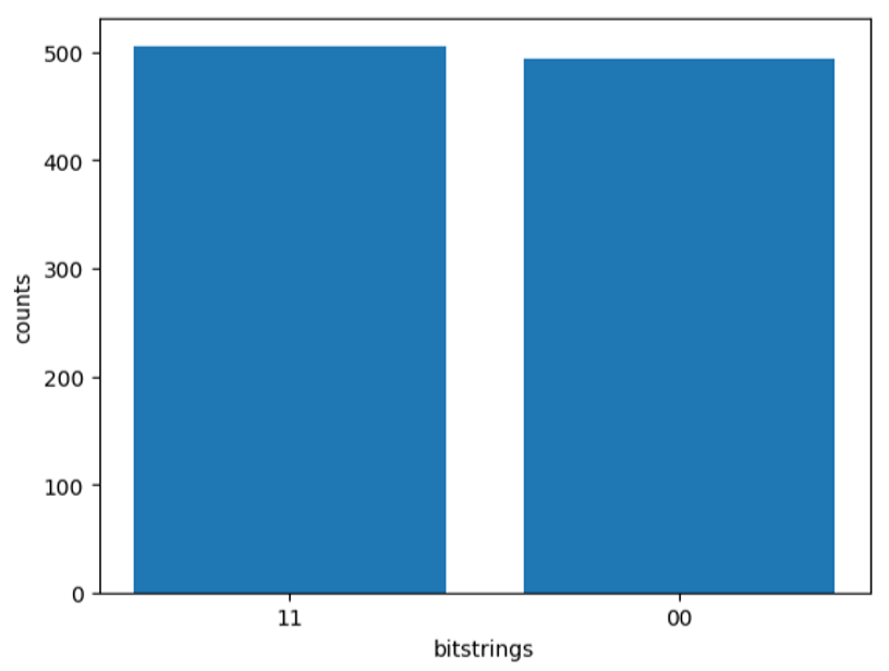 이 과정을 통해 벨 상태의 얽힘 특성에 따라 '00'과 '11' 결과가 거의 비슷한 비율로 나타나는 것을 직접 확인할 수 있습니다. 두 가지 상태 모두가 정확하게 500번씩 발생하지 않는 이유는, 양자 회로에 대한 수행 결과는 확률적이기 때문입니다. 또한 만약 노이즈가 발생하는 실제 QPU에서 이 회로를 실행하였다면, ‘01’ 또는 ‘10’ 상태가 추가적으로 발생할 수 있는 것도 기억할 필요가 있습니다.