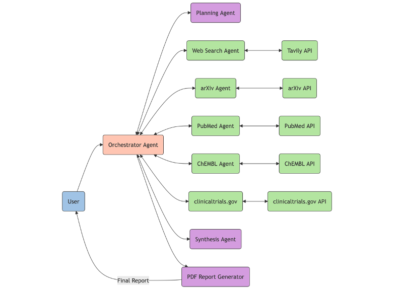 이 포스트에서는 Strands Agents와 Amazon Bedrock을 사용하여 신약 개발을 위한 강력한 연구 어시스턴트를 만드는 방법을 보여드립니다. 이 AI 어시스턴트는 모델 컨텍스트 프로토콜(MCP)을 사용하여 여러 과학 데이터베이스를 동시에 검색하고, 발견한 내용을 종합하여 약물 타겟, 질병 메커니즘, 치료법에 대한 포괄적인 보고서를 생성할 수 있습니다.