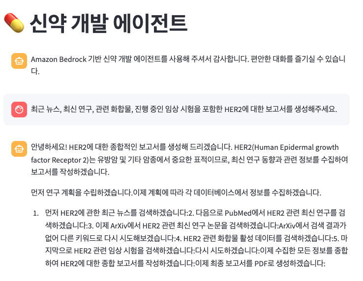 Strands Agents의 오케스트레이션 기능, 스트리밍 응답, 유연한 구성과 Amazon Bedrock의 강력한 언어 모델의 결합은 AI 지원 연구를 위한 새로운 패러다임을 만들어냅니다. 과학 정보의 양이 계속해서 기하급수적으로 증가함에 따라, Strands Agents와 같은 프레임워크는 신약 개발에 필수적인 도구가 될 것입니다.
