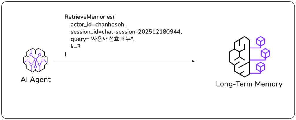 하지만 실제 애플리케이션 개발 시 매번 이렇게 SDK를 직접 호출하여 메모리를 관리하는 것은 번거로울 수 있습니다. 다음 섹션에서는 Strands Agents SDK를 활용하여, 에이전트가 대화 과정에서 자동으로 기억을 저장하고 불러오도록 연동하는 방법을 알아보겠습니다.