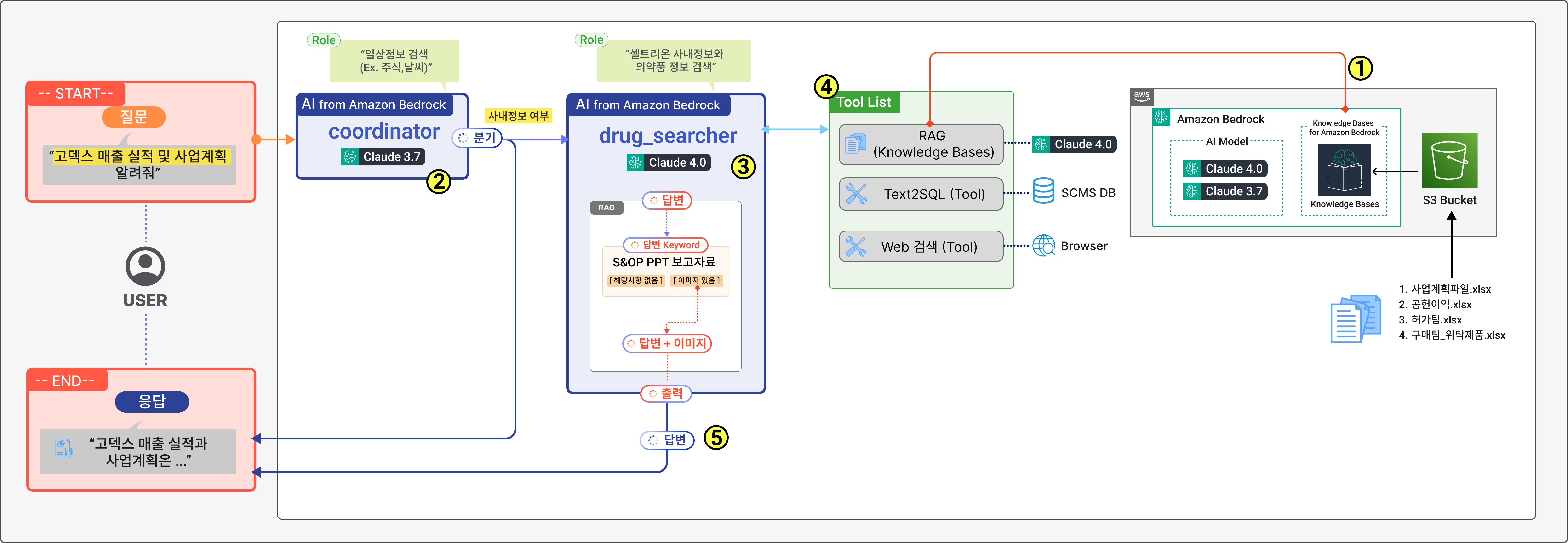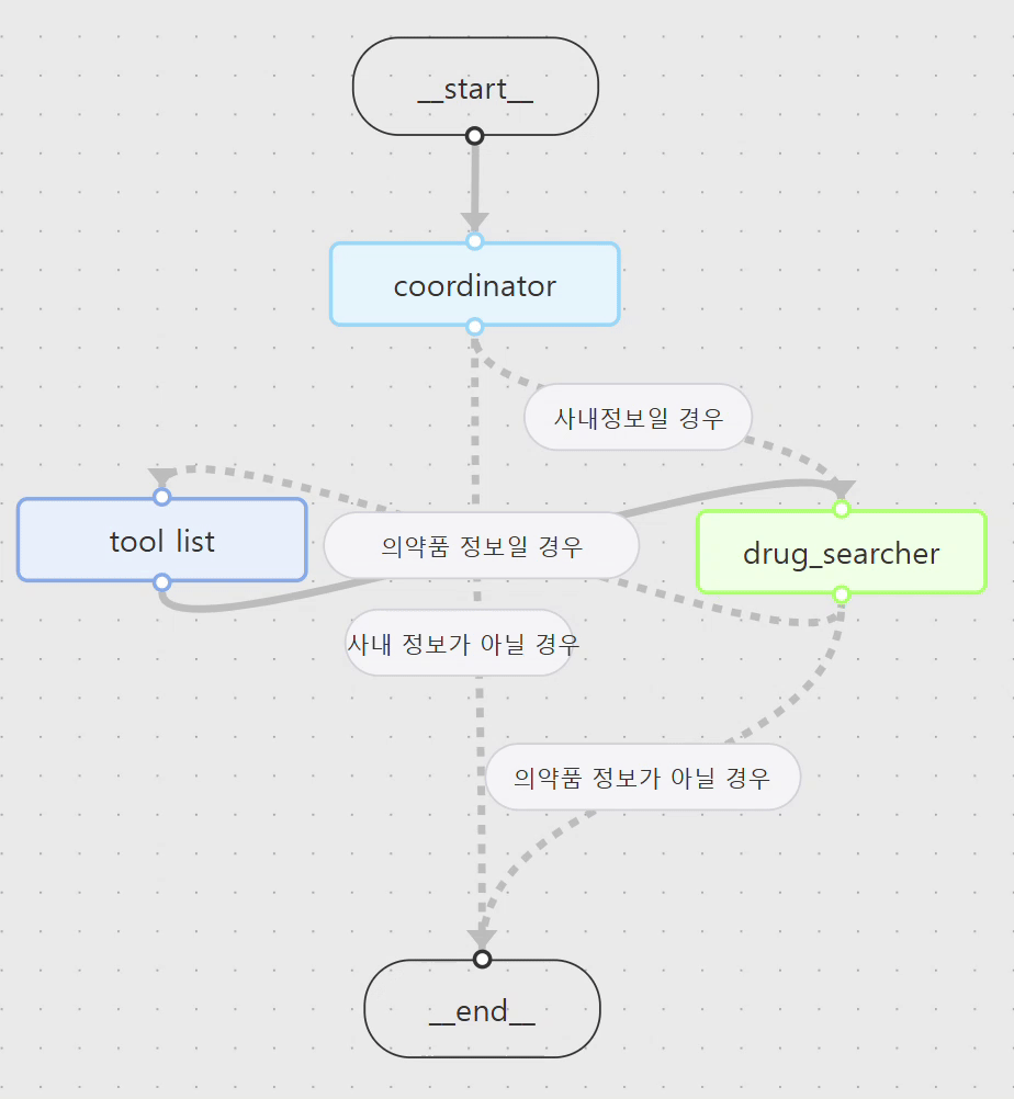 2. 사용자 질문이 들어오면 coordinator 에이전트는 일반적인 질문에 대한 답변을 하거나, 사내정보 검색이 필요할때는 drug_searcher 에이전트로 사용자 요청을 전달합니다.