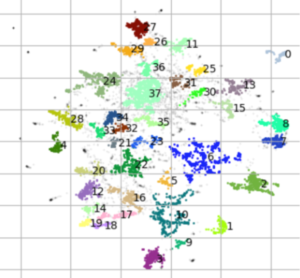 - 클러스터링 – 세 번째 단계에서는 차원 축소된 데이터 포인트들을 HDBSCAN(Hierarchical Density-Based Spatial Clustering) 알고리즘을 사용하여 군집화했습니다. 하이퍼 파라미터는 min_samples=20으로 설정했으며, 이는 주관적 판단에 따라 선택되었습니다. 그 결과 총 38개의 서로 다른 클러스터가 생성되었습니다.