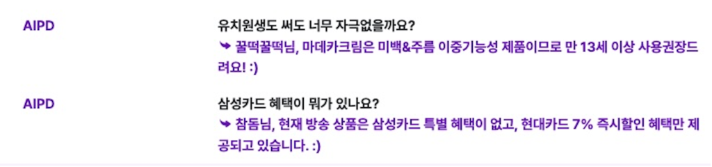 여기에서는 2025년 9월에 진행된 두 개의 라이브 홈쇼핑 방송에 실제로 Agentic AI 기반 실시간 지능형 응답 시스템이 적용된 결과를 바탕으로 응답 속도와 트래픽 부하에 따른 영향도에 대해 알아보도록 하겠습니다. 총 1098개의 코멘트에 대해 AI가 응답을 제공하였는데 아래는 일부 질문과 응답 예시입니다.