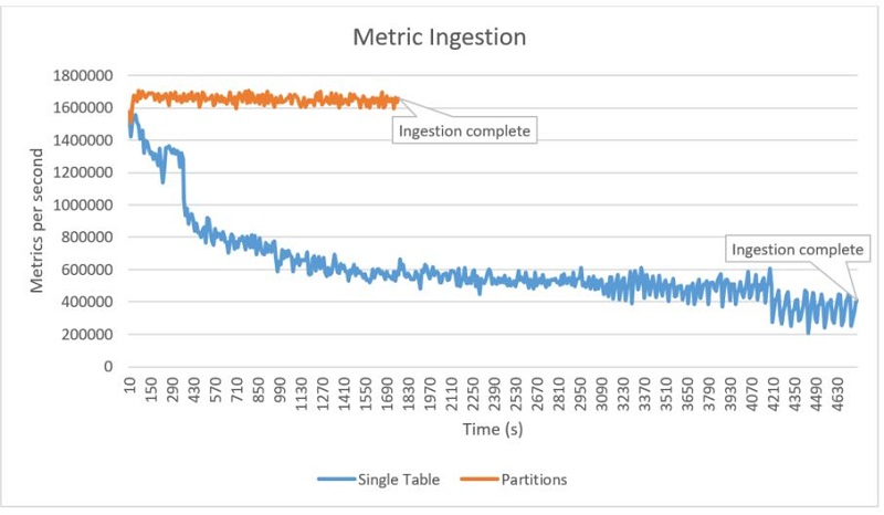 이전 그래프에서 보았듯이, 데이터 수집의 세부 사항은 결과에 큰 영향을 미칠 수 있습니다. 다음 그래프는 파티셔닝된 테이블을 사용한 수집과 대형 단일 테이블을 사용했을 때의 데이터 수집을 비교한 것입니다. 파티션 그래프가 훨씬 더 짧은데, 이는 작업이 훨씬 빠르게 완료되었기 때문입니다. 또한 부하가 지속되는 동안 초당 160만 개의 메트릭 처리량이 안정적으로 유지되는 것을 확인할 수 있습니다.