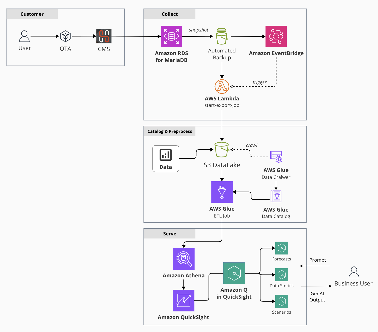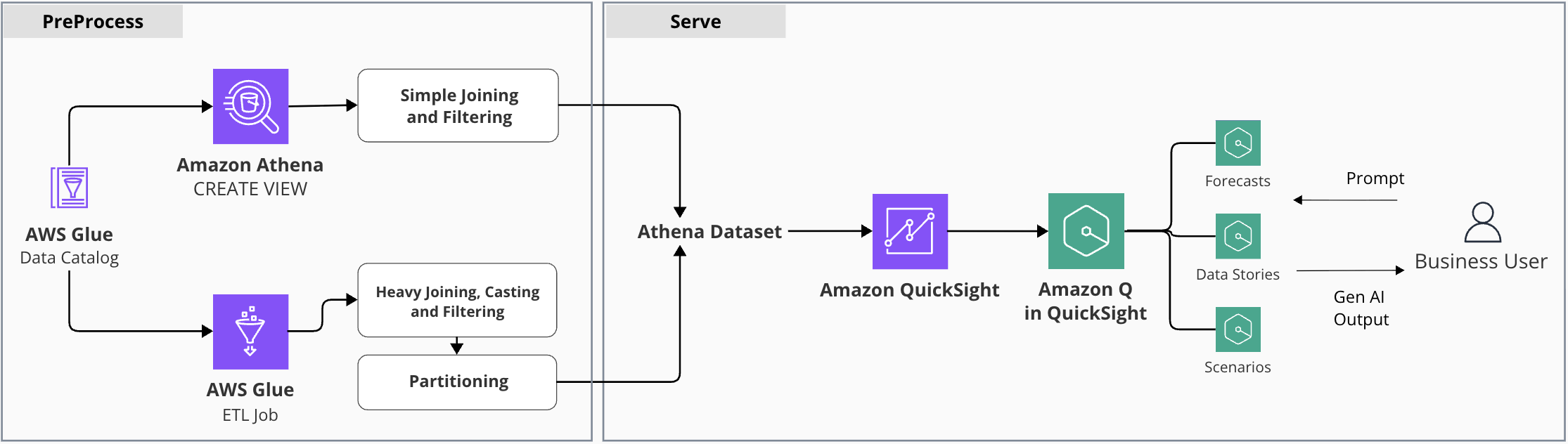 - 데이터 서빙: QuickSight 에 Athena 데이터 세트를 연결합니다. Q in QuickSight의 AI 어시스턴트가 비즈니스 담당자의 분석 요구를 처리합니다.