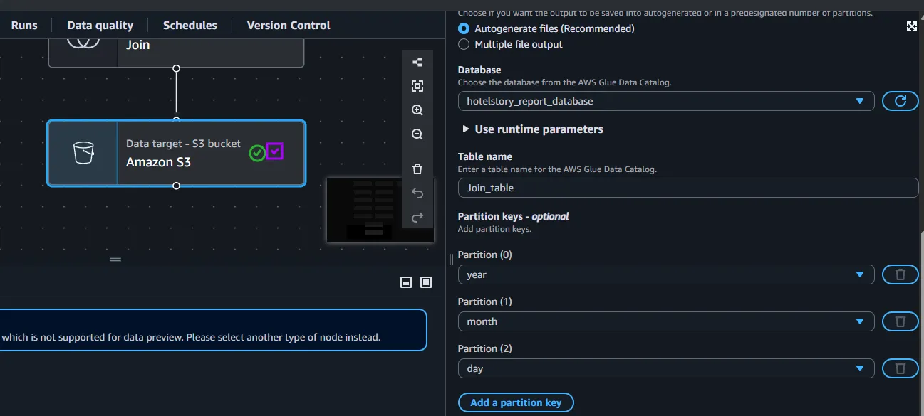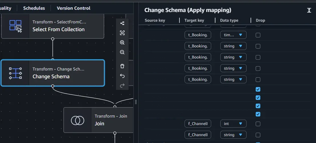 스냅샷 데이터는 비압축 원본 기준 평균 50GB 상당입니다. 예약 · 상품 · 채널에 걸친 복수 테이블은 일괄적인 정제 및 상호 조인 작업이 필요합니다. 이러한 요구를 AWS Glue Studio의 시각적 ETL 작업에서 지원하는 인터페이스와 작업 노드로 처리하여 컬럼 선택, 타입 캐스팅, 정규화, 테이블 조인을 구현했습니다.
