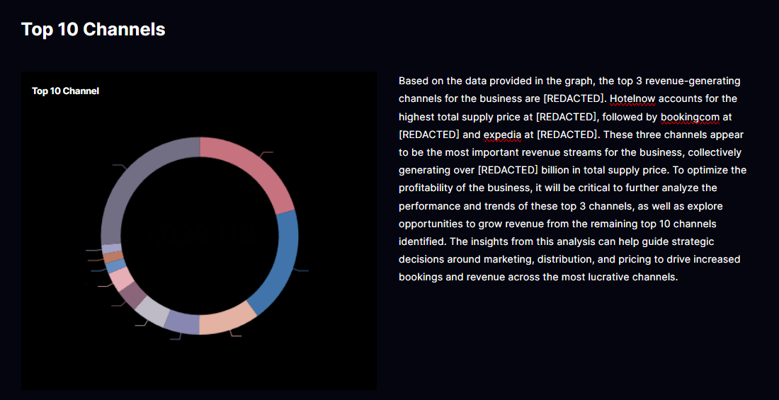 HotelStory는 Q in QuickSight 를 중점으로 BI 도구를 제공하는 전략을 택했습니다. 세일즈 팀이 자연어로 구사한 광범위한 질문에, 생성형 어시스턴트가 필요한 지표를 집계하고 맥락 있는 서술형 인사이트(데이터 스토리)를 제공합니다. 덕분에 월간 매출이나 채널별 실적 같이 주기적인 확인이 필요한 지표를 개발실 개입 없이 신속하게 획득 가능합니다.