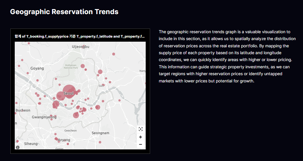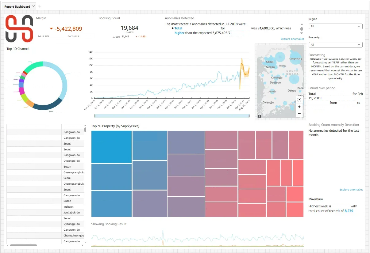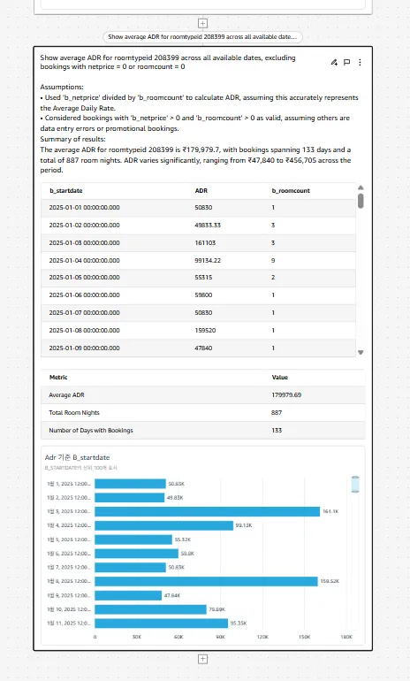 더욱 중요한 것은 하나의 통합 화면에서 핵심 KPI부터 채널별 기여도, 숙소별 성과, 지역별 분포까지 동시에 점검할 수 있게 되어 운영 우선순위가 명확해졌다는 점입니다. 트리맵과 도넛차트를 통해 상위 성과군을 빠르게 식별하고 리소스(예산/인력/재고)를 집중할 수 있게 되었으며, Q in QuickSight 시나리오 분석으로 즉각적인 심층 분석을 요청하여 데이터 전문 지식 없이도 복잡한 비즈니스 인사이트를 도출할 수 있게 되었습니다.