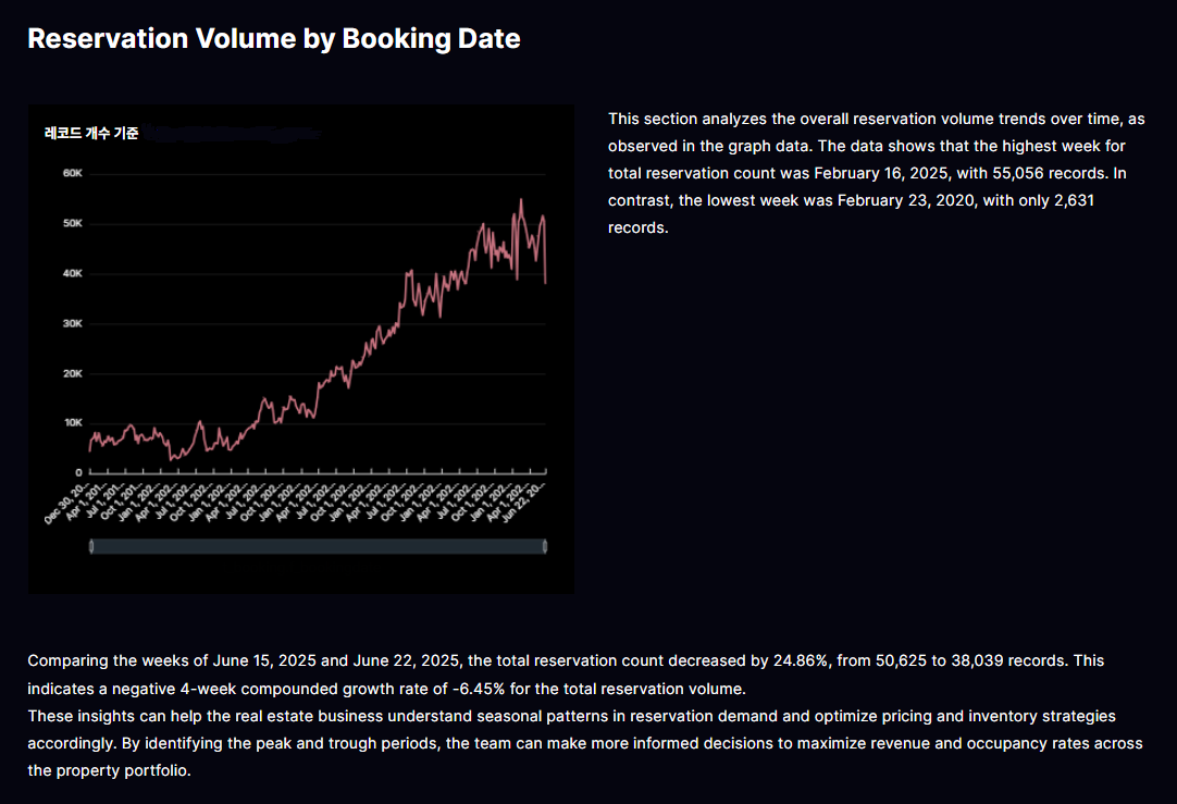 호텔스토리는 예측형 수요 모니터링과 공급가 모니터링 대시보드 도입을 통해 데이터 기반 운영의 혁신적 변화를 경험했습니다. 기존 수작업 리포트 작성에 소요되던 며칠의 분석 시간이 몇 분으로 단축되었으며, 이상 탐지와 데이터 스토리 기능이 “언제/어디서/무엇이 달랐는지”를 자동으로 문장화하여 이상 징후에 대한 즉시 액션이 가능해졌습니다.