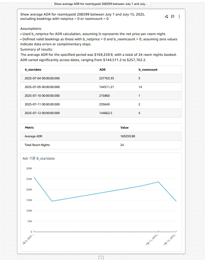 첫 질문은 특정 객실의 기간별 ADR(객단가) 추세를 빠르게 훑어보는 것입니다.