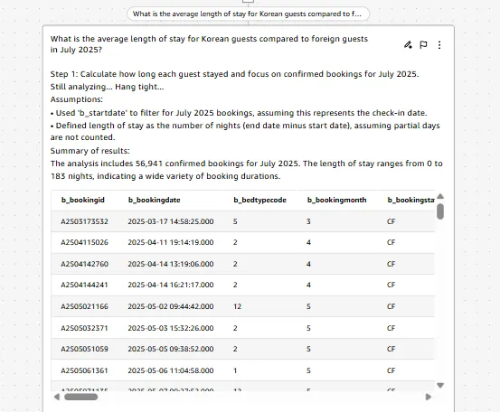 Q in Quicksight 는 자연어 질의의 연속성과 세분화된 통계 비교를 한 흐름으로 이어 주는 것이 강점입니다. 이번 시나리오는 “외국인 고객이 국내 고객보다 체류가 더 긴가?”라는 질문에서 시작해, 체류일(LOS) 계산 → 국적별 비교 → 후속 KPI 탐색으로 확장하는 과정을 보여줍니다