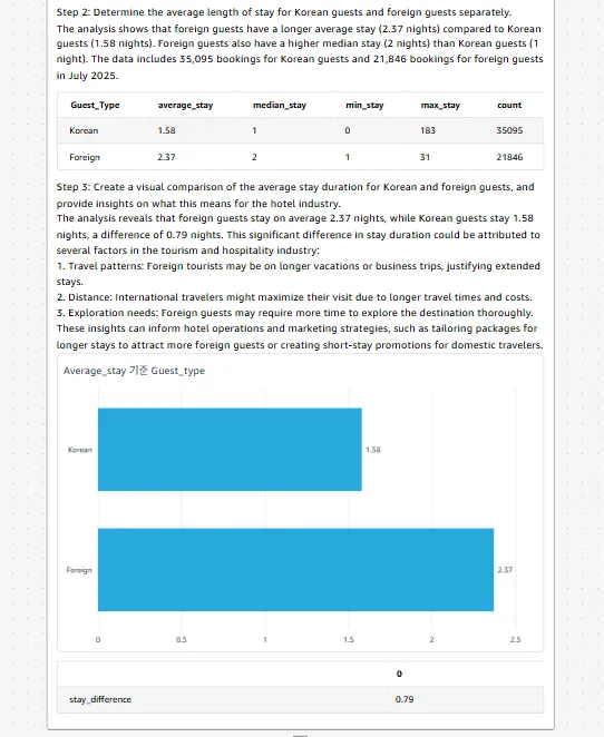 이 단계는 이후 있을 모든 분석의 기준선을 세우는 과정입니다. 운영 측면에서 LOS 값은 프런트 인력 배치, 객실 회전, 장기 숙박 상품 설계시 근거가 됩니다. LOS를 고정해 국적 · 채널 · 숙소별 후속 분석을 진행하면 동일한 잣대로 의미를 해석할 수 있습니다.