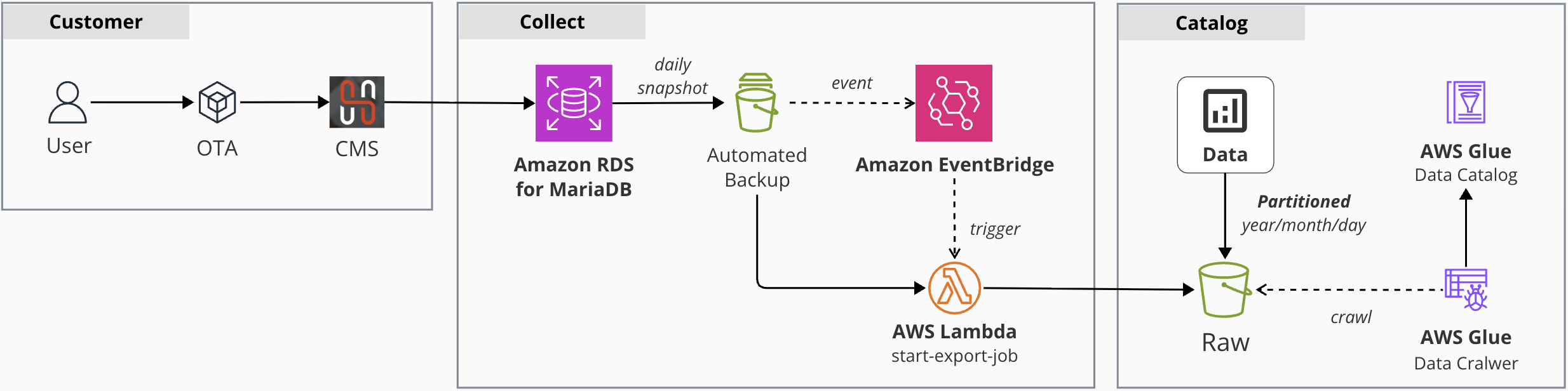 - 데이터 수집: Amazon RDS 자동 백업 스냅샷을 Amazon S3 버킷으로 내보내는 자동 파이프라인을 구축합니다.