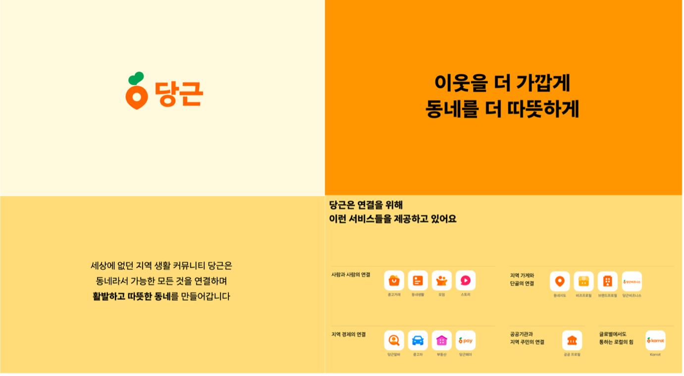당근은 대한민국을 대표하는 지역생활 커뮤니티로서, 동네에서 가능한 모든 연결에 중심을 둔 서비스입니다. 단순한 중고 거래를 넘어 이웃, 지역 가게, 공공 기관 간의 연결을 강화하고, 따뜻하고 활발한 동네를 만드는 것을 핵심 가치로 삼고 있습니다.