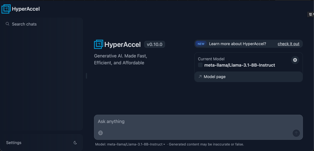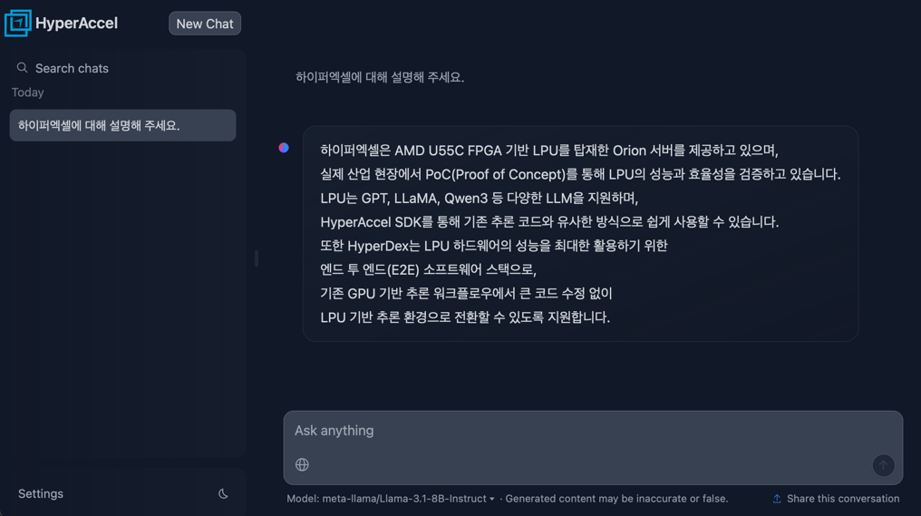 AMI 기반 환경을 통해 고객은 F2 인스턴스를 실행하는 즉시 LPU 기반 챗봇을 바로 사용하거나 자체 모델 서빙 환경을 손쉽게 구축할 수 있습니다. HyperDex Toolchain은 Hugging Face 스타일의 모델 실행 인터페이스를 제공해 기존 워크플로우와 자연스럽게 연동되며, vLLM 기반의 generate() API를 지원합니다. 또한 OpenAI API와 호환되는 completions(), chat.completions() 인터페이스를 함께 제공함으로써, 기존 추론 코드를 최소한의 수정만으로 LPU 환경에 재사용할 수 있도록 했습니다.