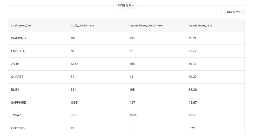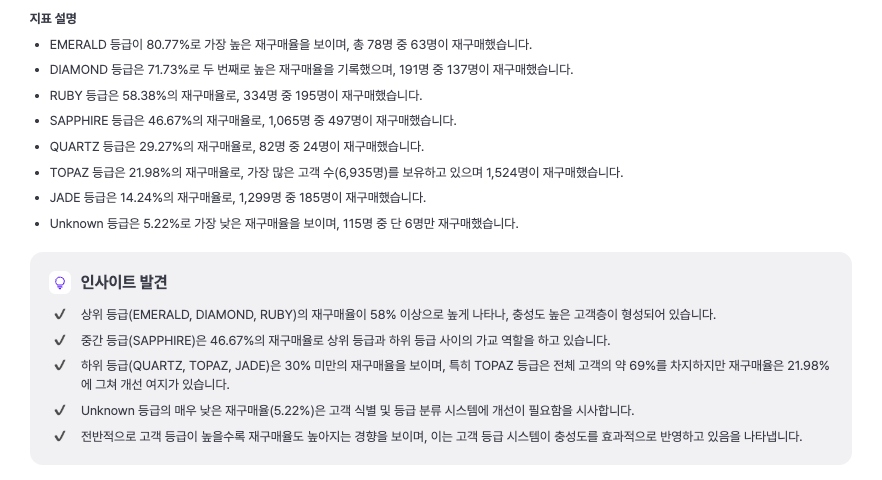 • 업무 효율성 대폭 향상: 복잡한 엑셀 작업이나 분석가 요청 대기 시간 없이 즉시 분석 결과를 얻을 수 있게 되어 업무 속도가 크게 개선되었습니다.