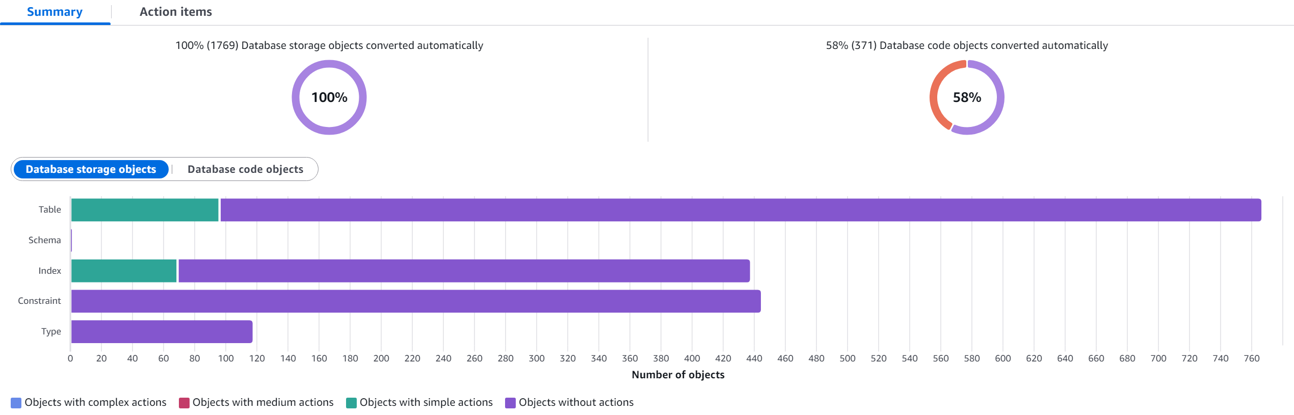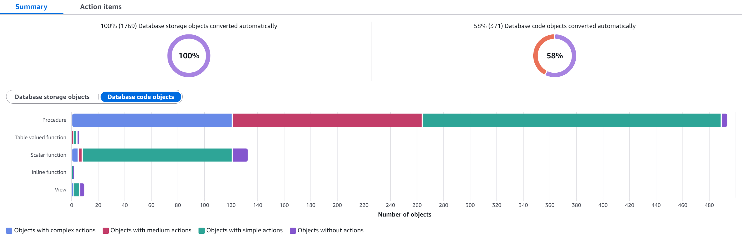 변환되지 않은 코드 객체에 대해서는 DMS Action Items 탭을 활용하여 구체적인 이슈와 권장 조치를 식별할 수 있었습니다. 전체적으로 약 17,794건의 변환 작업 항목이 식별되었으며, 이 중 274개의 코드 객체는 수작업이 필요한 항목으로 분류되었고, 약 161건은 복잡도 높은 Complex 수준의 작업으로 분석되었습니다.