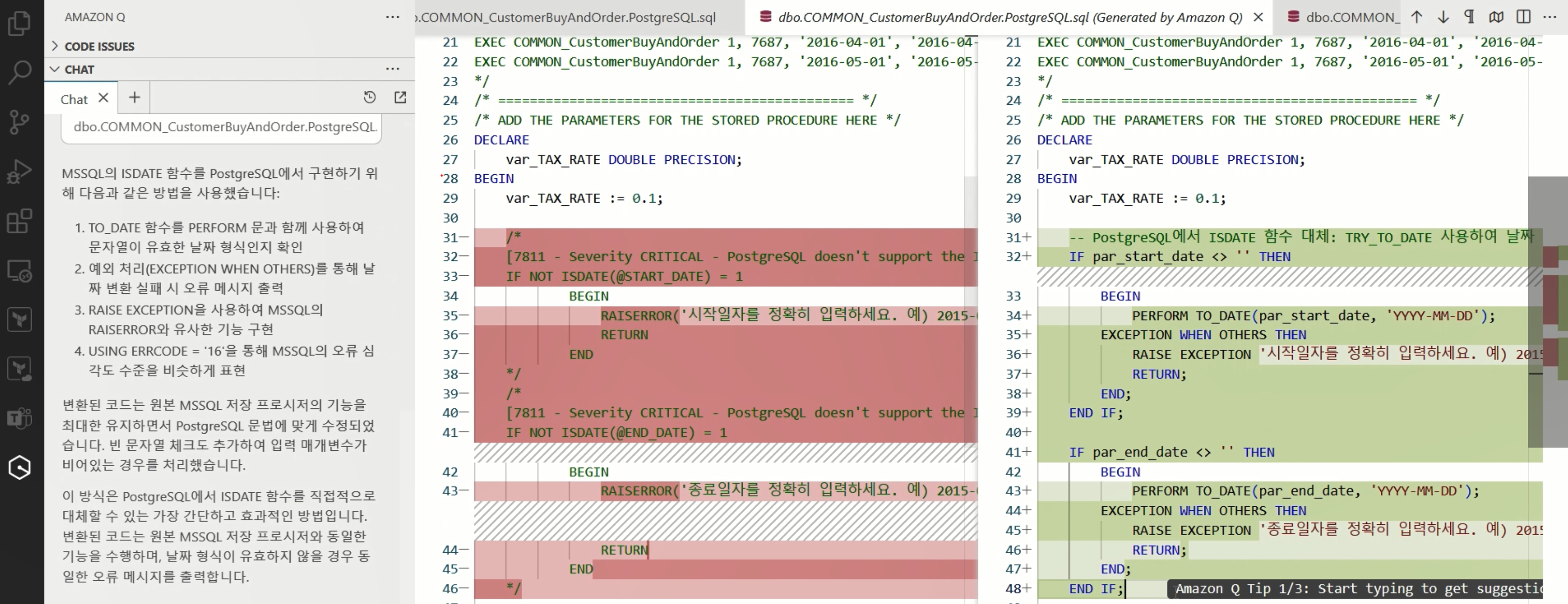 3) Amazon Q Developer의 파일·폴더 단위 접근을 통해 전체 저장 프로시저와 함수 폴더에 대해 ‘특정 오류를 일괄 고쳐달라’는 식의 프롬프트를 제출함으로써, 짧은 기간 내에 대량 변환을 완료할 수 있었습니다.