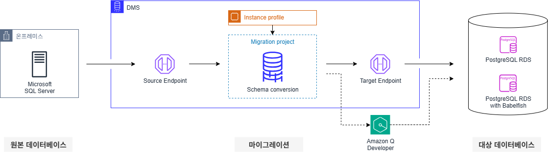 본 프로젝트는 두 가지 이기종 데이터베이스로의 마이그레이션을 실험적으로 검증하는 방식으로 설계되었습니다. 하나는 기존 MSSQL에서 Amazon RDS for PostgreSQL로의 마이그레이션이며, 다른 하나는 MSSQL에서 Aurora PostgreSQL with Babelfish로의 T-SQL 호환성 기반 전환을 검토하였습니다. 전체 시스템의 테이블 구조와 저장 객체는 SCT 및 DMS를 통해 자동 변환과 데이터 이관을 진행하였고, 복잡한 쿼리 및 저장 프로시저는 Babelfish와 Amazon Q Developer가 단계별로 연계하여 처리하였습니다.