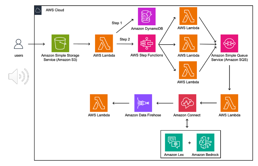 - Map state: 아래 2번부터 6번까지의 로직을 동시에 병렬로 실행하기 위해 Step Functions의Map state를 활용합니다. Map state의 MaxConcurrency (최대 동시성)을 100으로 설정하여 한 번의 실행으로 여러 통화 요청을 병렬 처리할 수 있도록 합니다. (이 요청은 원활한 동시성 관리를 위해 Amazon SQS Queue로 전달됩니다)