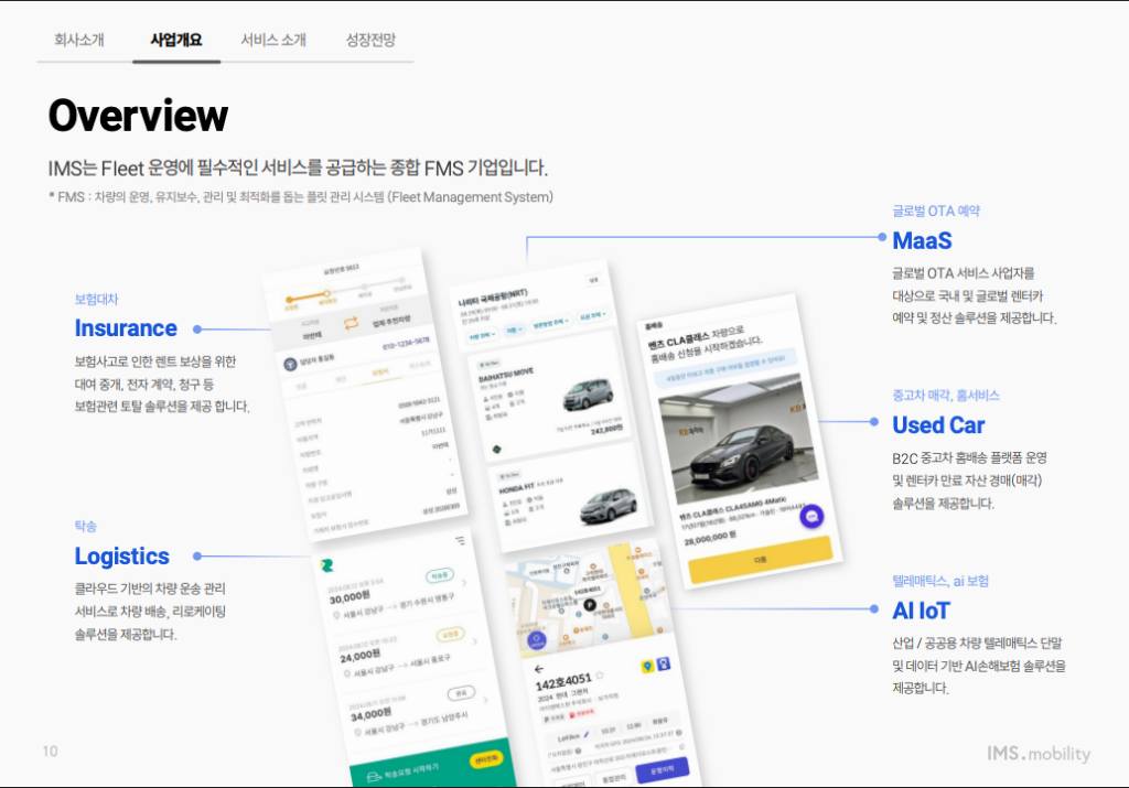 IMS 모빌리티는 렌터카, 탁송, 보험, 차량 관리 등 여러 영역으로 파편화된 모빌리티 시장을 하나의 클라우드 시스템으로 통합하는 토탈 모빌리티 솔루션 기업입니다. 분산된 시장이 초래하는 데이터 단절과 운영 비효율성의 문제를 기술의 힘으로 해결하고, 차량 구매부터 이용, 관리 그리고 판매까지 필요한 모든 솔루션을 유기적으로 연결하는 모빌리티 생태계를 구축하는 것을 목표로 합니다.