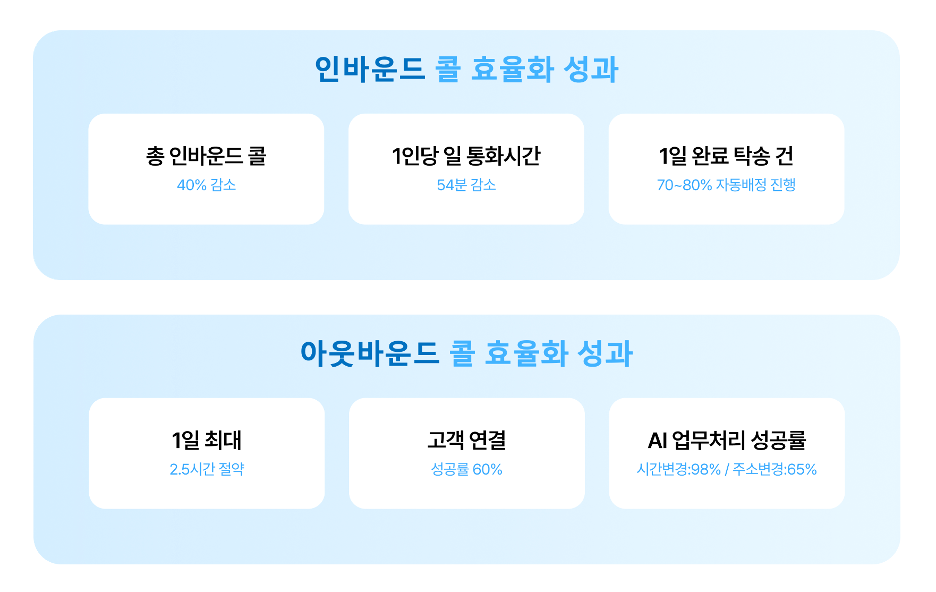 운영팀은 아웃바운드 업무에서 1인당 하루 최대 2시간 30분, 인바운드 업무에서 일 평균 54분의 통화 시간을 절약할 수 있었습니다. 인바운드 기사 배정 솔루션을 통해 기사님들의 단순 문의 건들이 IVR 단계에서 자동 해결되면서 운영팀으로 인입되는 전체 콜 수가 40% 가량 감소하였고, 아웃바운드 고객 일정 확인 솔루션을 통해서는 매일 처리되는 전체 탁송 건의 70%에서 80%가 운영팀의 개입 없이 AI Agent를 통해 자동으로 배정되고 있습니다. 이러한 자동화 덕분에 팀의 업무 집중도가 크게 향상되었습니다.