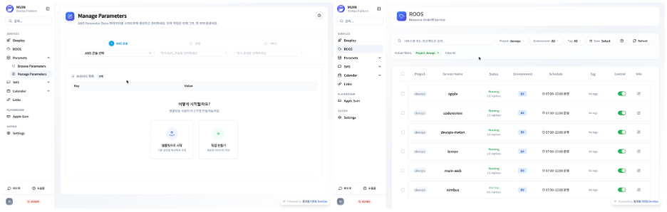 | 수동 작업(AWS Parameter Store 변경, 서버 스케줄링 등)이 DevOps 팀에 집중되어 병목 발생 | 해당 작업이 플랫폼 내부 기능으로 흡수되면서, 개발자는 스스로 배포·롤백을 수행하고 DevOps는 아키텍처 고도화에 집중 |
