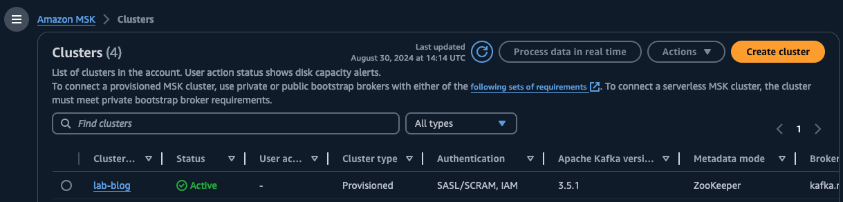 MSK 클러스터가 생성이 완료되면 상태가 Active로 표시됩니다.