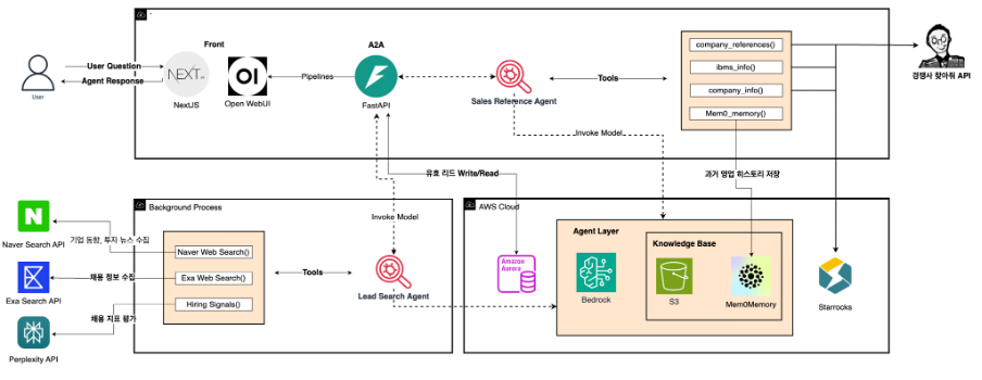 - Bedrock 기반 모델을 통해 추론 작업을 수행하고, S3에는 세션간 대화 맥락, Mem0Memory에는 영업 이벤트 이력을 저장합니다. 이를 통해 각 기업별 과거 전략 및 히스토리를 기반으로 맞춤형 대응이 가능합니다.