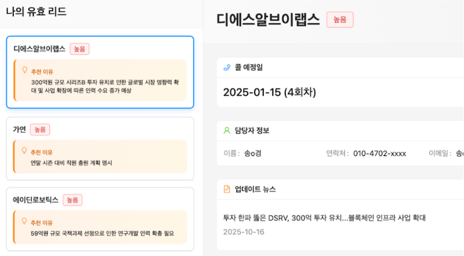 또한, 오늘 등록 리드 영역을 별도로 두어, 해당 날짜에 새로 등록된 리드를 강조 표시했습니다. 오늘 등록 리드는 전체 리스트와 중복될 수 있으며, 기업명, 우선순위, 등록일, 업데이트 뉴스 등의 정보를 포함합니다.